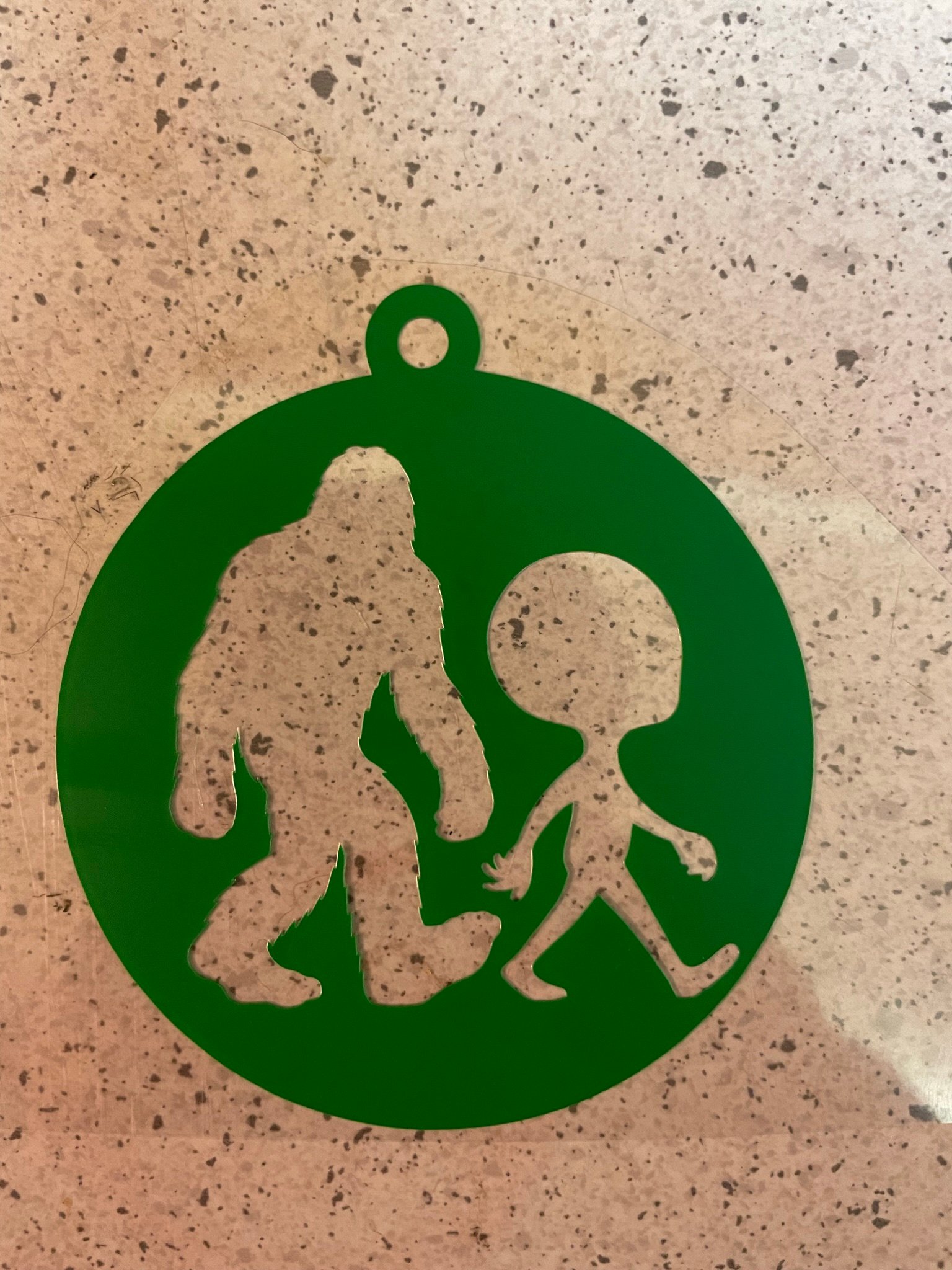 Worlds collide in the best way. This round sticker features a walking Bigfoot and a friendly alien side by side inside an ornament-style circle—perfect for fans of cryptids, UFO lore, and tongue-in-cheek Northwoods humor.